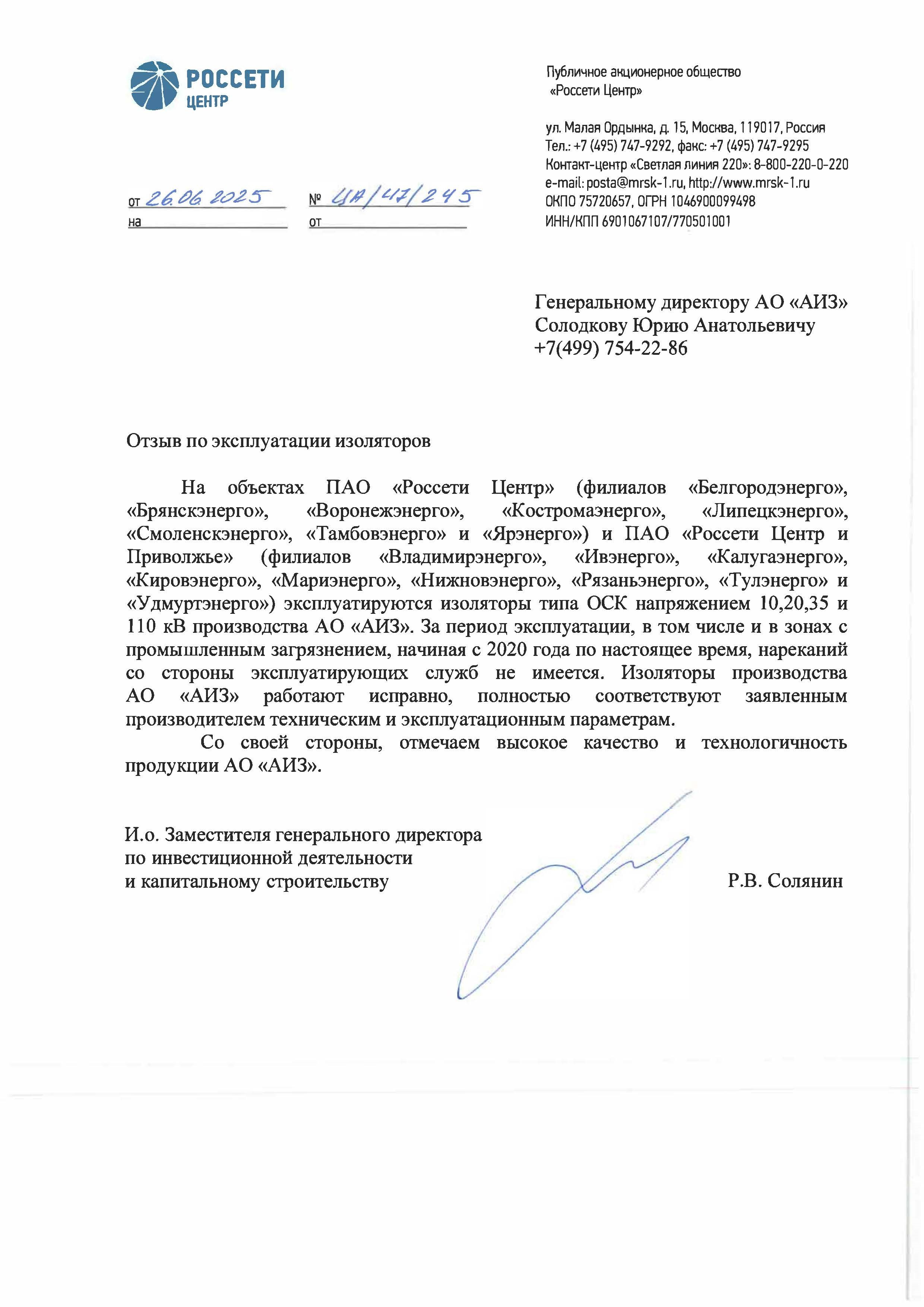 За период эксплуатации, в том числе и в зонах с промышленным загрязнением, начиная с 2020 года по настоящее время, нареканий со стороны эксплуатирующих служб не имеется. Изоляторы производства АО «АИЗ» работают исправно, полностью соответствуют заявленным производителем техническим и эксплуатационным параметрам. Со своей стороны, отмечаем высокое качество и технологичность продукции АО «АИЗ».
