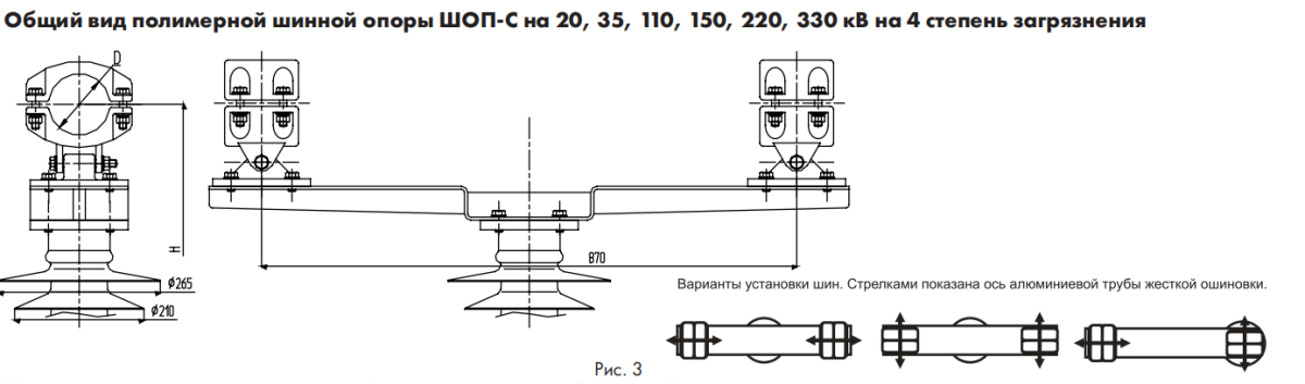 Шинные опоры наружной установки типа ШОП-С предназначены для установки и поддержания двух алюминиевых труб жесткой ошиновки напряжением 10кВ в открытых распределительных устройствах (ОРУ) электрических станций и подстанций. Шинные опоры ШОП-С входят в состав комплексного типового проекта жесткой ошиновки подстанций. При необходимости установки труб разного диаметра необходимо заполнить опросный лист и оформить специальный заказ.