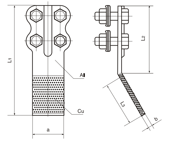 Зажим применяется для присоединения к медным выводам аппаратов или выводам плакированным медью. Лапка зажима полностью медная. Соединение медной лапки с алюминиевой частью монолитное. Соединение с проводом болтовое. Отверстия в лапке прокалываются специальным инструментом на месте монтажа или заказываются на заводе. Инструмент возможно также заказать на нашем заводе.