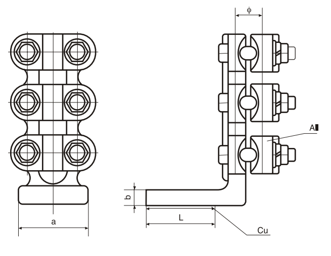 Зажим применяется для присоединения к медным выводам аппаратов или выводам плакированным медью. Лапка зажима полностью медная. Соединение медной лапки с алюминиевой частью монолитное. Соединение с проводом болтовое. Отверстия в лапке прокалываются специальным инструментом на месте монтажа или заказываются на заводе. Инструмент возможно также заказать на нашем заводе.