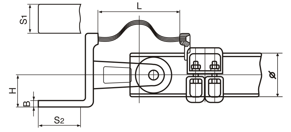 Зажим предназначен для соединения алюминиевой трубы жесткой ошиновки с выводами аппаратов, расположенными горизонтально. Зажим имеет одну гибкую связь и подвижное крепление лапки к шине.