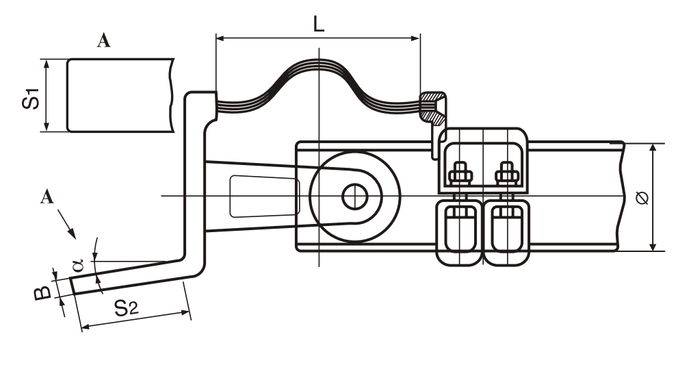 трубы жесткой ошиновки с выводами аппаратов, расположенными под углом. Зажим имеет одну гибкую связь и подвижное крепление лапки к шине. Возможно изготовление зажимов с лапкой, покрытой медью. Необходимые отверстия прокалываются при монтаже или непосредственно указываются в заказе для изготовления на заводе.