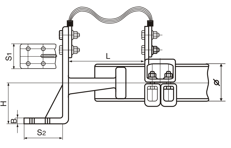 Зажим предназначен для соединения алюминиевой трубы жесткой ошиновки с выводами аппаратов, расположенными горизонтально. Зажим имеет одну гибкую связь и подвижное крепление лапки к шине. Возможно изготовление зажимов с лапкой, покрытой медью. Возможно изготовление лапок с отверстиями