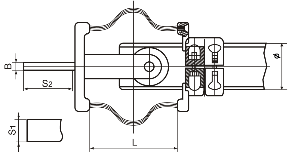 Зажим предназначен для соединения алюминиевой трубы жесткой ошиновки с выводами аппаратов, расположенными, горизонтально. Зажим имеет двойную гибкую связь и подвижное крепление лапки к шине. Это необходимо для передачи больших токов. Необходимые отверстия прокалываются при монтаже или непосредственно указываются в заказе для изготовления на заводе. Возможно изготовление лапки зажима