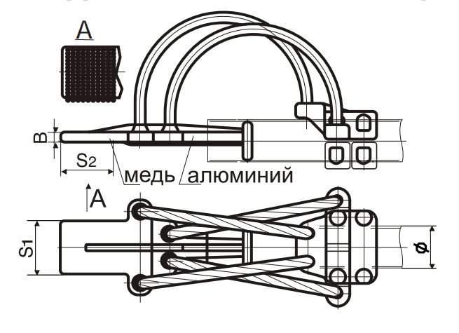шине. Отверстия для крепления к аппаратам прокалываются при монтаже. Возможно изготовление лапок с отверстиями под крепление по заказу. Лапка зажима для присоединения к медным выводам аппаратов покрыта слоем меди.