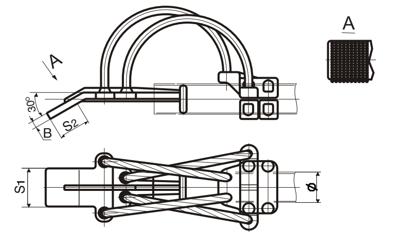 Зажим предназначен для соединения алюминиевой трубы жесткой ошиновки с выводами аппаратов, расположенными под углом 30 градусов.Зажим имеет гибкую тросовую связь и подвижное крепление лапки к