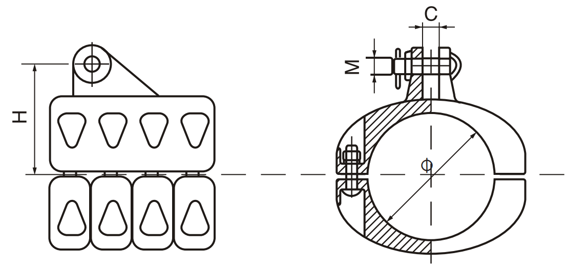 шины жесткой ошиновки в тех местах, где невозможна установка шинных опор ШОП. Зажимы ЖОС-4 для больших диаметров подвешиваются на V-образных гирляндах для фиксации шины вдоль оси. Подвеска производится на полимерных или стеклянных