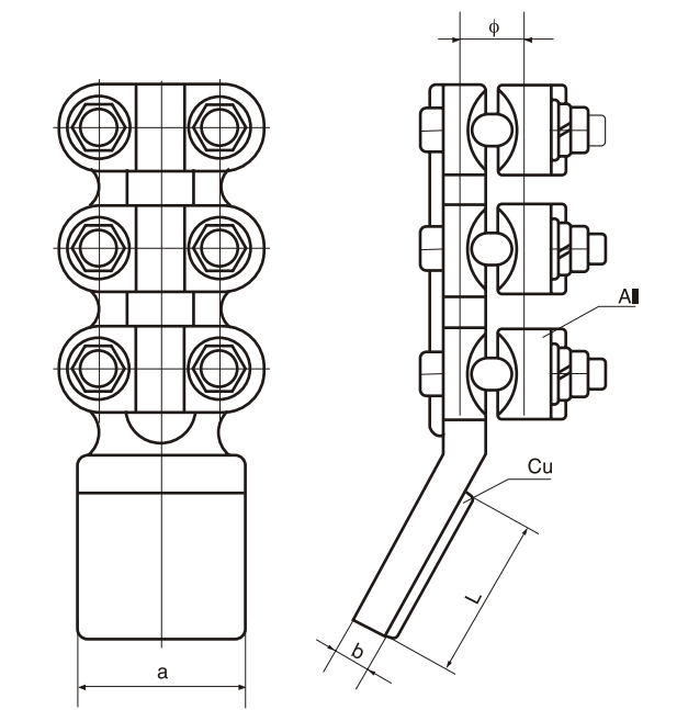 Зажим применяется для присоединения к медным выводам аппаратов или выводам плакированным медью. Лапка зажима полностью медная. Соединение медной лапки с алюминиевой частью монолитное. Соединение с проводом болтовое. Отверстия в лапке прокалываются специальным инструментом на месте монтажа или заказываются на заводе.Инструмент возможно также заказать на нашем заводе.
